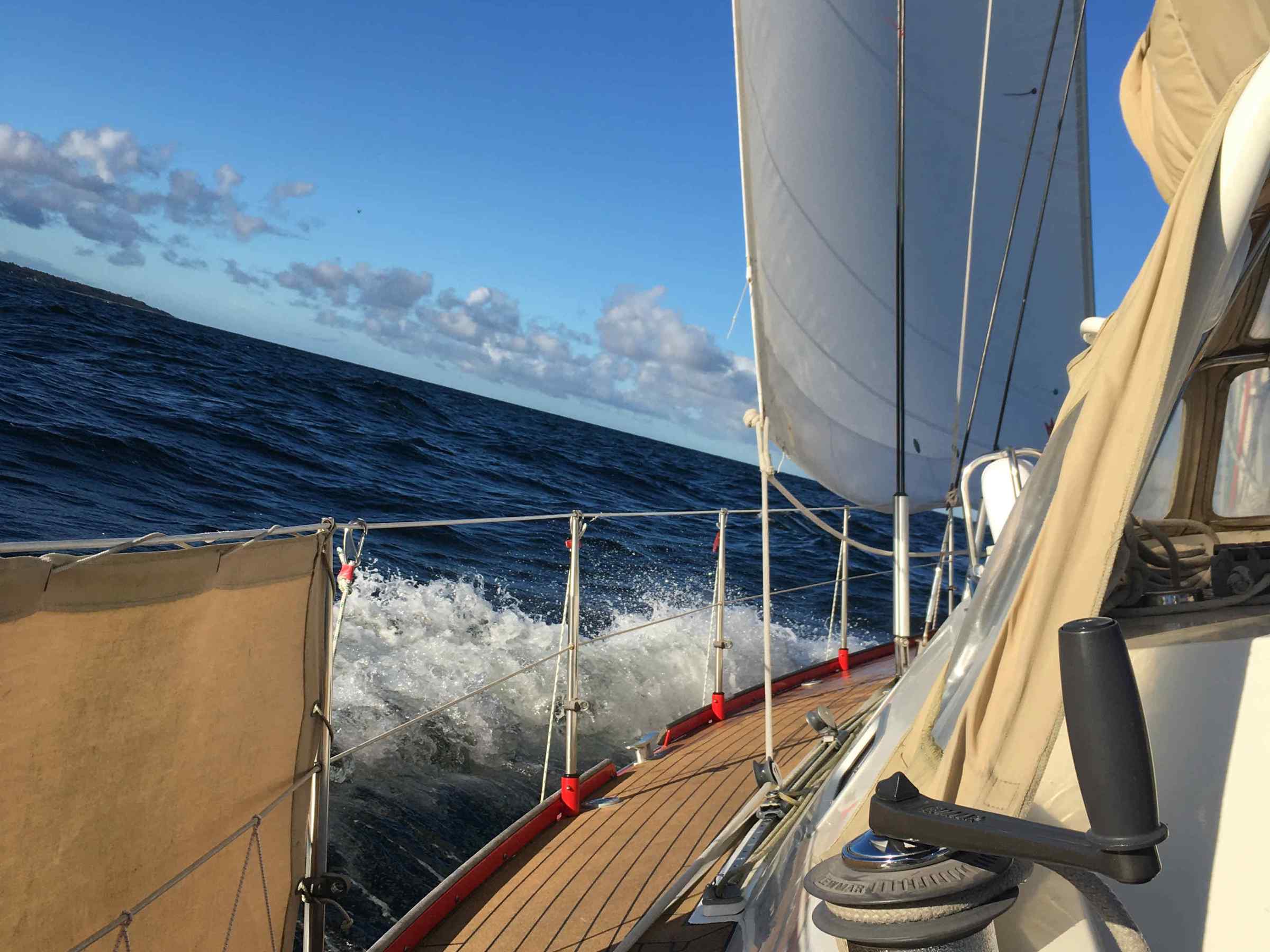 Destination Odden Havn 33 nautical miles. There was a little swell still on the water but nothing too bad, we were definitely ready to move so off we went. The morning was fantastic with sun and a perfect amount of wind and angle for sailing. The forecast was for dropping winds however of course we got the exact opposite with wind and swell rising considerably – welcome back to the water! About half way through the journey we surrendered to F6 winds and put a reef in the main sail (reduced the size of the sail due to the strong wind) it provided a bit of relief and settled us down a bit but then the wind continued to build along with the swell and at about the 3/4 mark we put a second reef in the main, it was getting pretty messy.