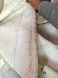 Now any of you that know me well, know that I enjoy sewing and can be quite crafty with a needle and thread however you will be amused to read that this hand sewing job involved needles the size of crowbars (I may be exaggerating a little, but not much) as well as gloves, pliers, leather and metal hand protector and thread thicker than dental floss (Heather I don’t recommend taking up sail repairs by hand sewing as a hobby). Anyway it had to be done, so we took the main sail off the tracks on the mast and threaded it down through the saloon hatch into the boat and I got busy with it.
