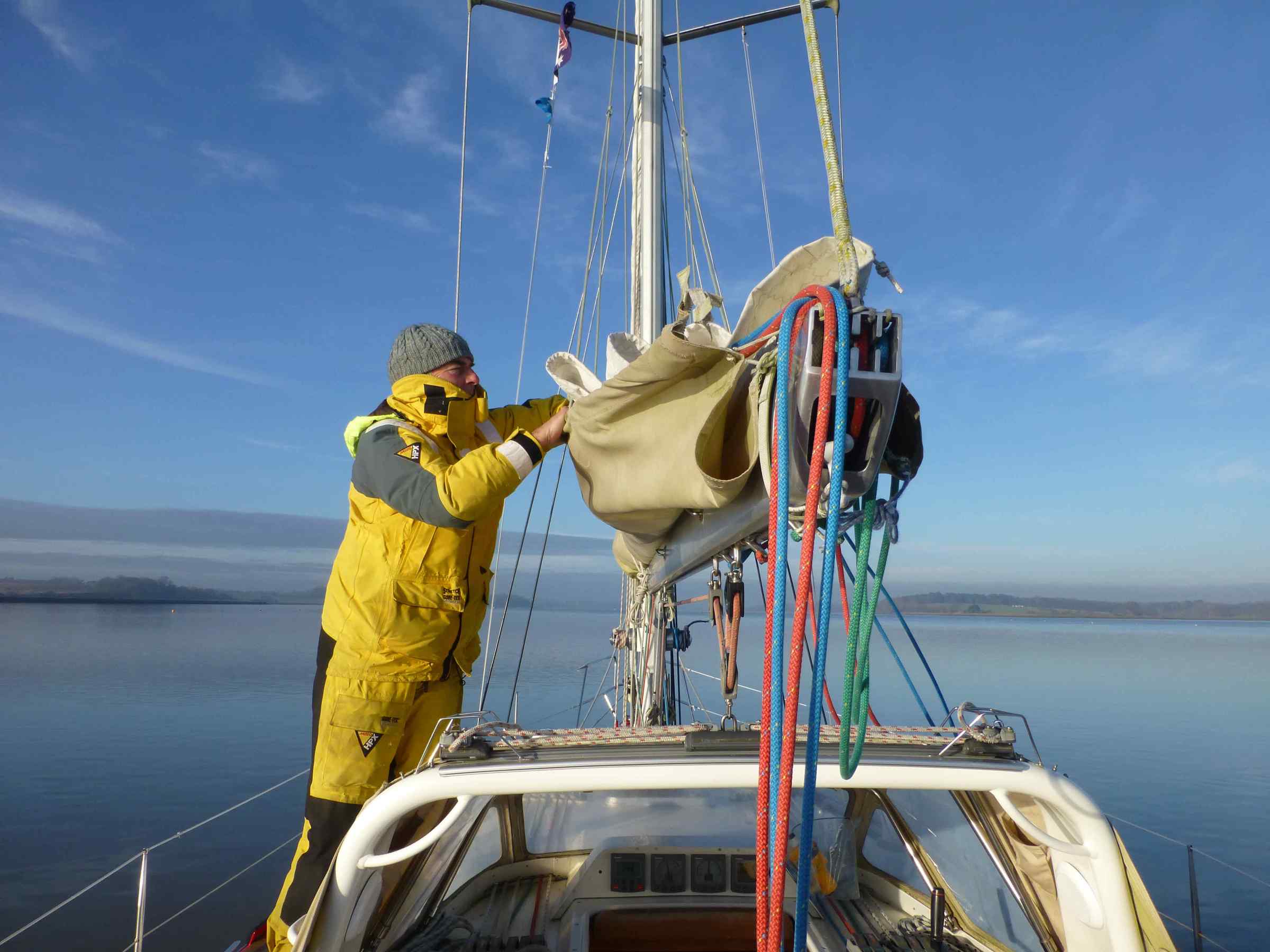 Packing the sail away for the final time in 2017, notice the calm River Orwell water