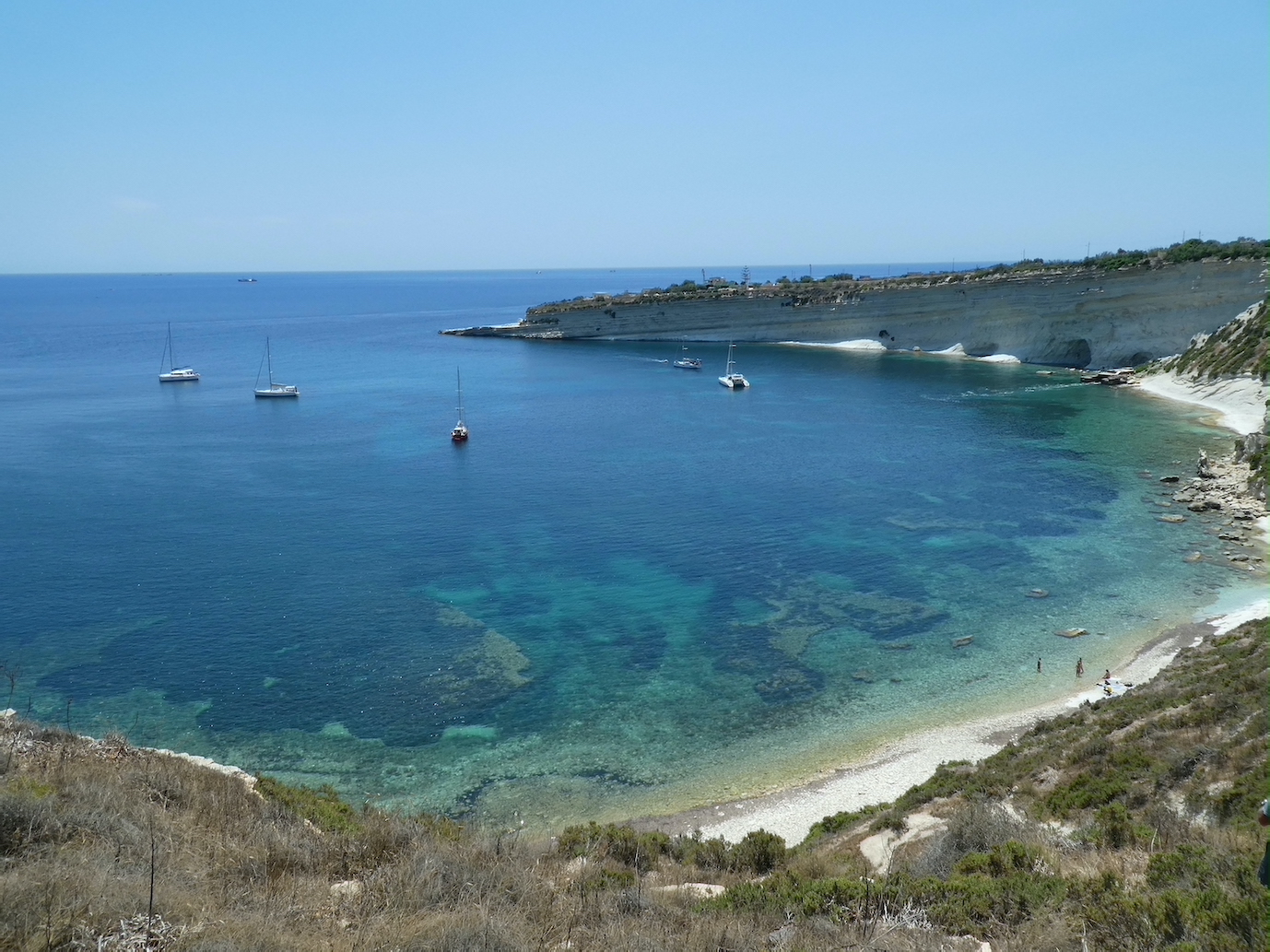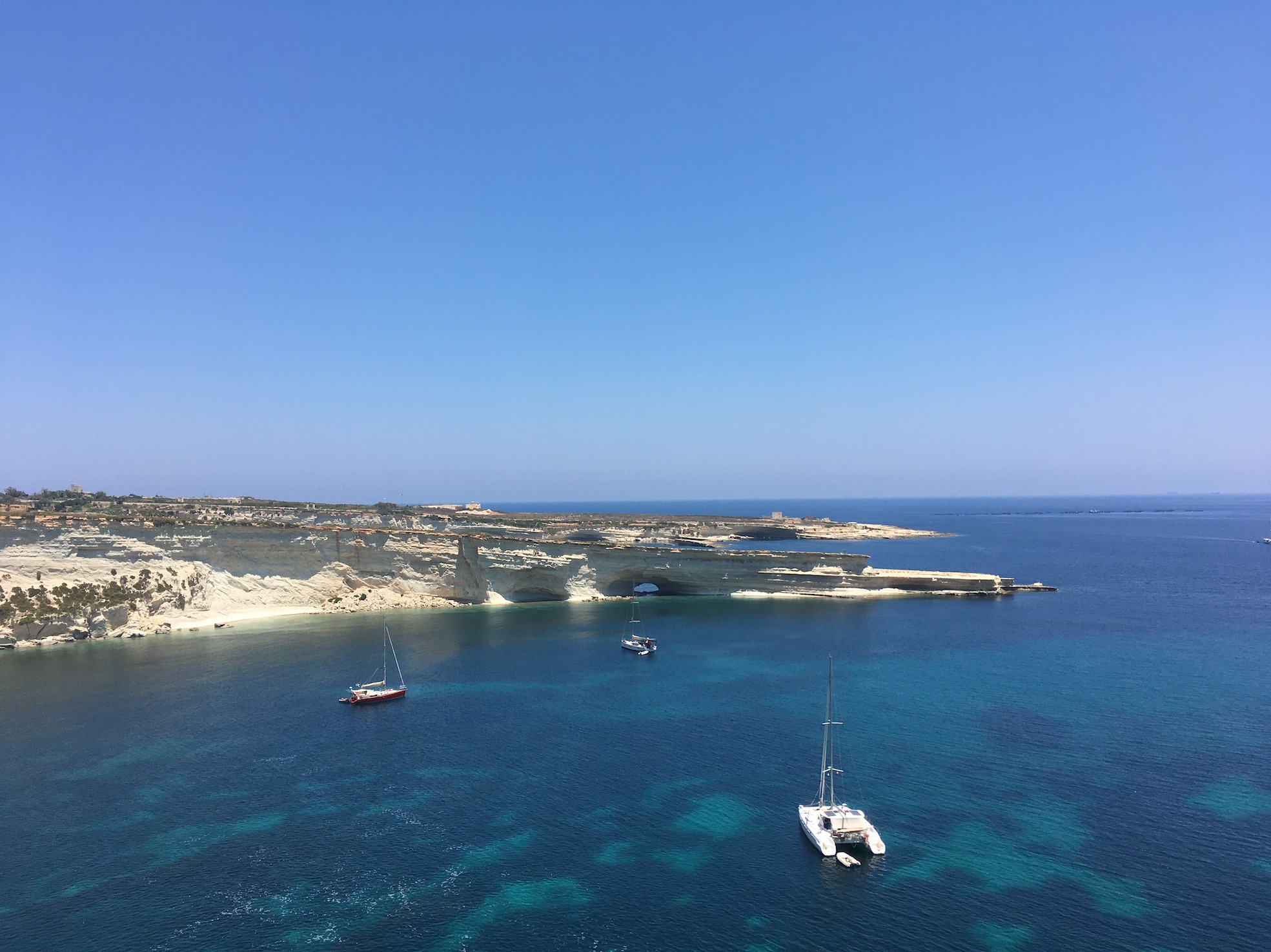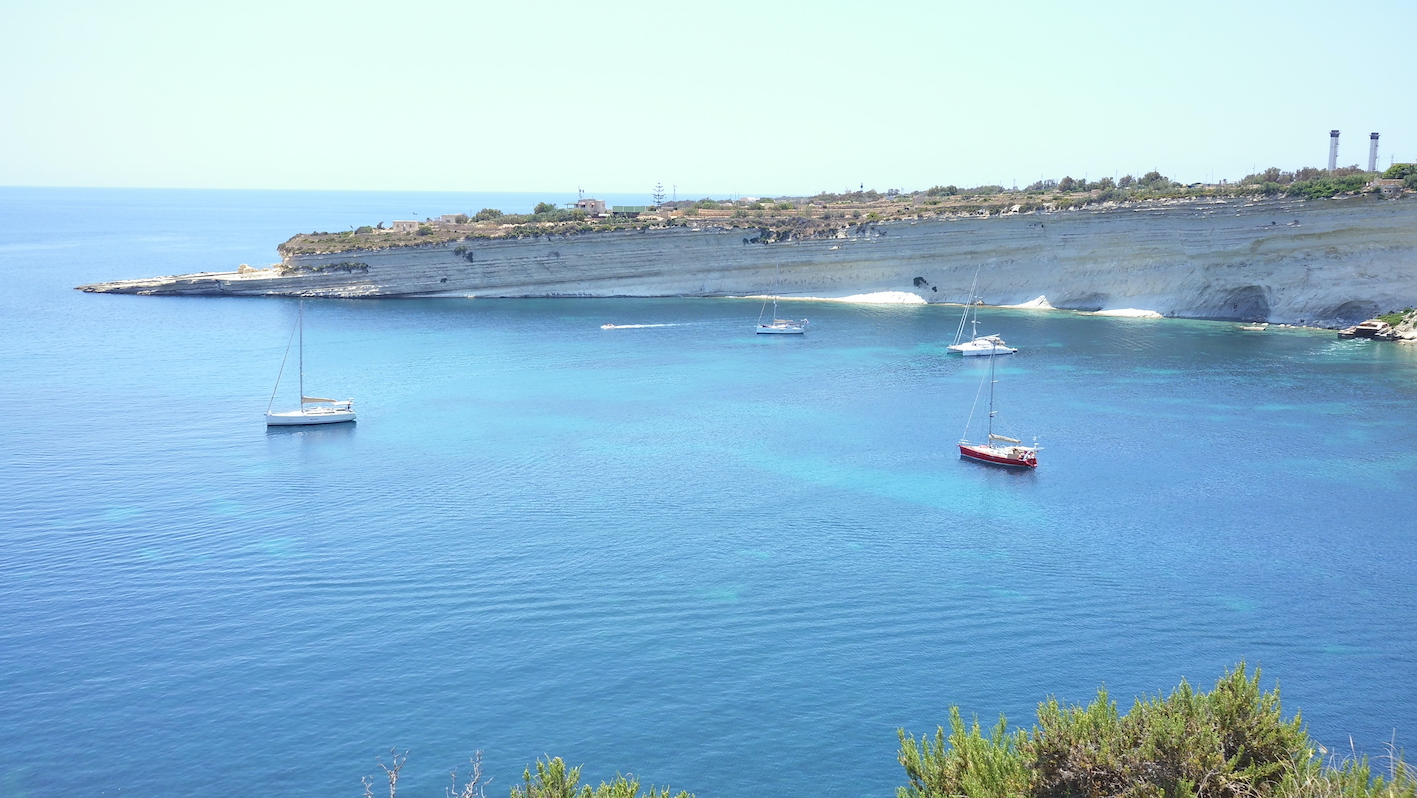 Our next stop involved a change of anchorages and we spent a lovely few hours on the water sailing 20 nautical miles from the northern end of the island to the southern end anchoring in Hofra Zghira just next to St Peters Pool. Perfect wind and glorious sunshine to sail down under main sail with the wind at our backs and travelling with the residual swell so calm waters.