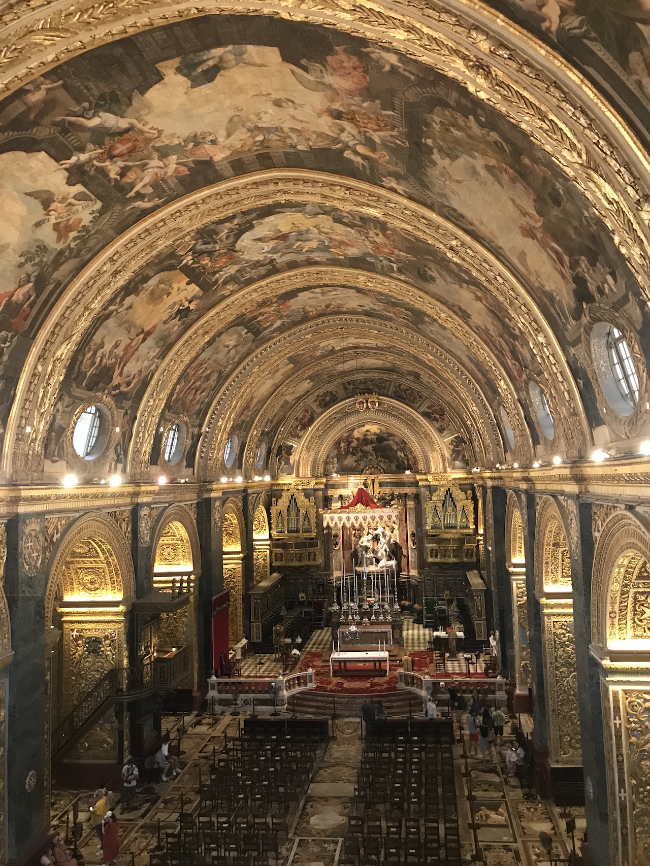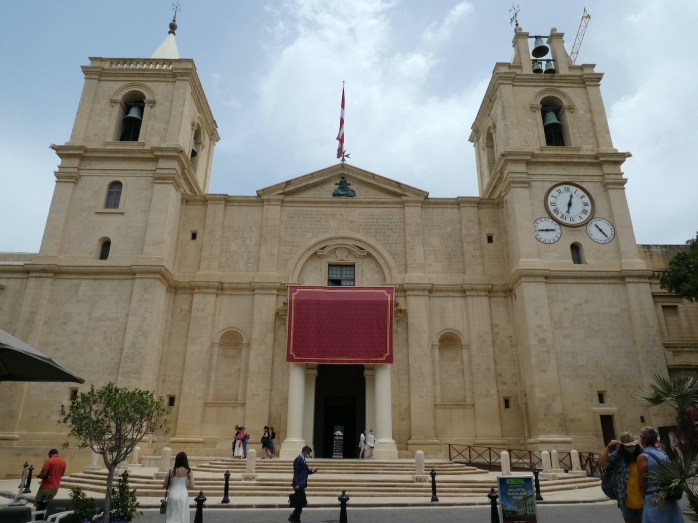 St Johns Cathedral has to be one of the most impressive churches I have ever had the privilege to visit.  I have to admit at first I was a little put off by the entrance fee of €15 per person but now having visited I can first hand say it was well worth it.   The plain facade on the outside of the cathedral renders the interior a real surprise. The nave (main hall) is surrounded by six bays on each side which are each dedicated to the various lunges (or Knights divisions based on nationality) of the orders of St John and dedicated to their patron saints.  I will let the pictures tell the story of the beauty inside the walls.  We completed the self guided audio tour which took around 90 minutes and learnt a lot about this magnificent building (built between 1573 & 1578) as well as the Grand Masters and Knights of St Johns, religion, martyrs, art, paintings, beheadings and history.  Most impressive for myself is the floor which is entirely covered in intricate inlayed coloured marble tombs, which are the resting places of the knights who fell during the great siege, (high heels are banned from entering the building in order to protect the floor).