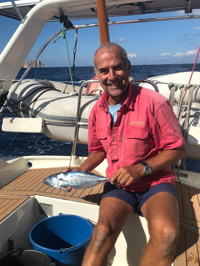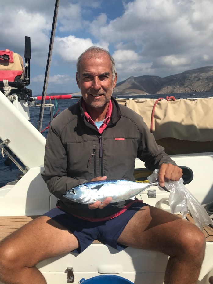 From the island of Amorgos it is a 40 nautical mile sail to our next destination the island of Astypalaia (which turns out to be a little hard to get my younger around so I refer to it as butterfly island as it is shaped like a butterfly).  That’s about 8 hours on the water and overall it was a pretty good passage, we did have to tick the engine over for 2.5 hours of the trip due to no wind but for the majority of the sail we were doing over 6 knots in in 10-12 knots of wind – most pleasant.  We had another successful day on the water in terms of fishing with Phil winding in two lovely size bonito fish – that’s dinner for the next two days sorted.