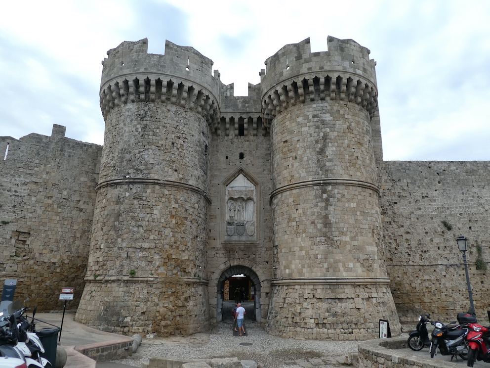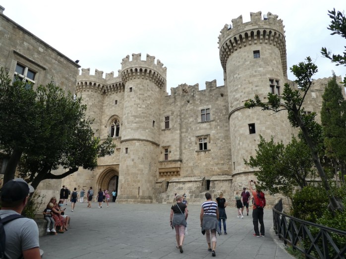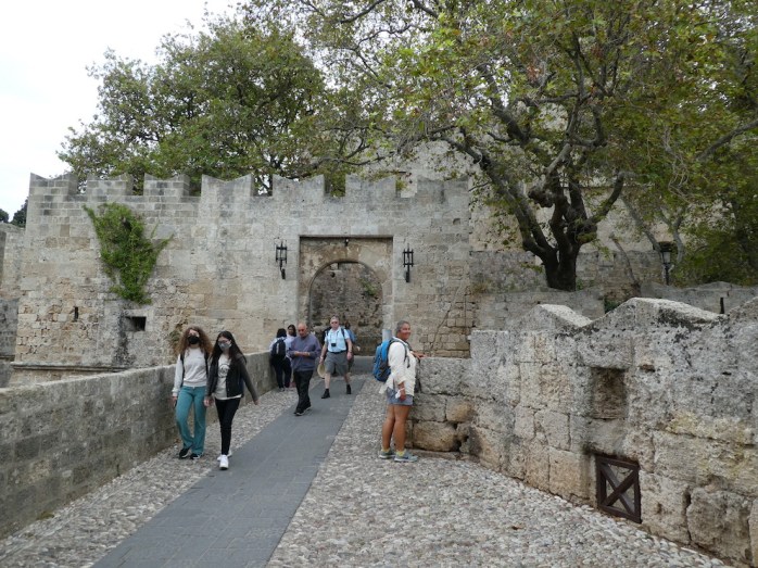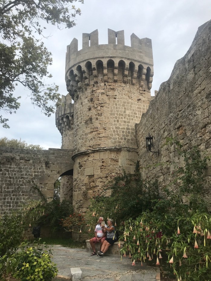 We anchored off the beach just a little behind the old and new towns of the island on the north east end.  We spent the next day exploring the old town, which was impressive, and larger than we were expecting, and to top it off double moated!!  We learnt that the Knights of St John (whom you may recall we talked of in Malta) used to be in Rhodes and were responsible for the construction of this place before leaving (being expelled following a siege by the Ottomans  in 1522) and resettling in Malta. After the old town we hunted in the new town for a few items we had on our buy list without a lot of success.  The following day was spent re provisioning at Lidl in preparation for Turkey.  We were stocking up on beer & wine & pork products.  Lidl was nearby and we did two trips and Red Roo is full of goodies to get us through the winter in a country that doesn’t eat pork and where alcohol is expensive.