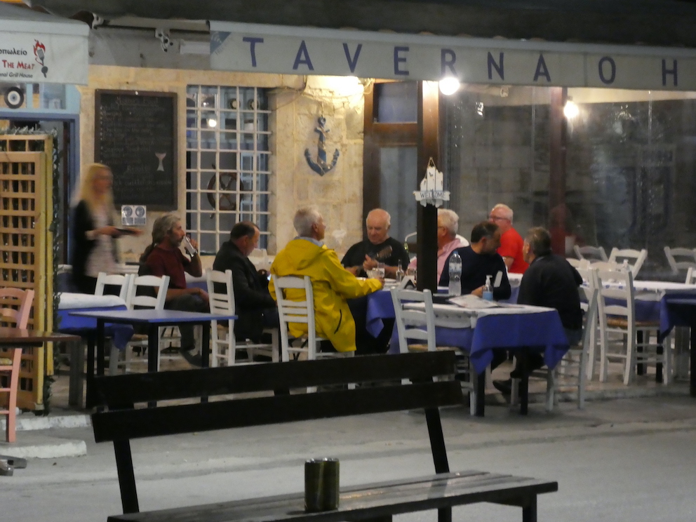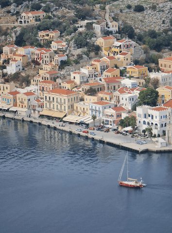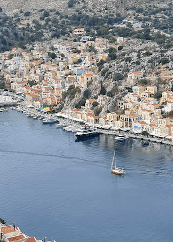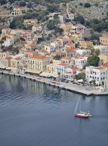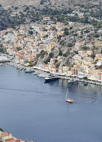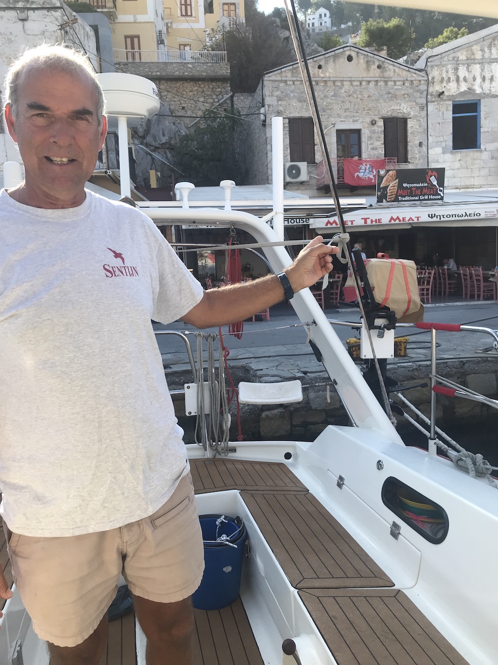 A highlight of Symi for Phil was the ability to order his dinner and have it delivered without leaving the boat.  We were tied to the dock in front of a Taverna and the waiter would often talk to us.  So come dinner time on our first evening Phil stood on the back of the boat and asked her for a gyros, 5 minutes later she brought it to the boat – at a cost of €2.50 he was one happy man.