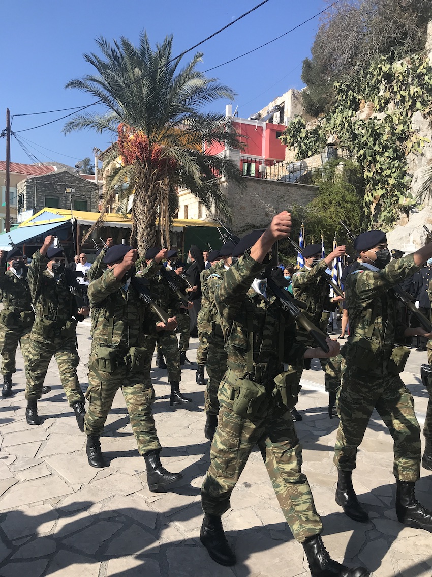 Anyway, Symi is lovely.  A really sweet small inlet harbour with colourful village on the hillside, with evidence of its Italian heritage in the architecture.  We enjoyed two days here and were there for the Greek national holiday “No Day” where back in 1940 the Greek Prime Minister said “No” to the Italian dictator Benito Mussolini who wanted to his forces to enter Greek territory and occupy strategic locations. We watched the ceremony and parade and then walked to the top of the village to get some pictures.