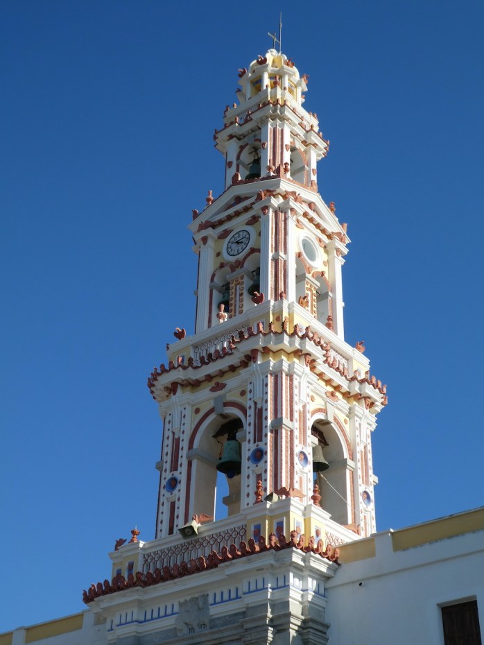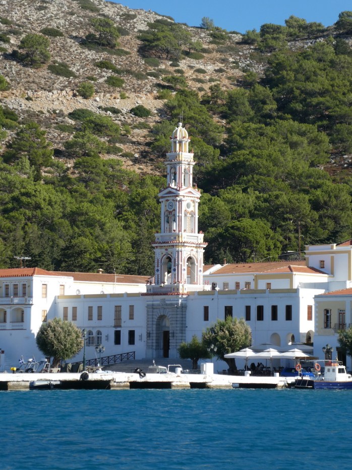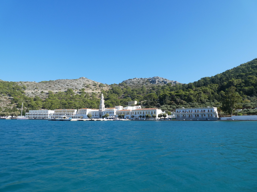 From Tilos it was a short 24 nautical miles to the bottom (south) end of Symi where we would stop just the one night before sailing onto the island of Rhodes the next day.  This bay of Symi called Panormitis is a Monastery and a very impressive large flash one at that!  We had read you need to be dressed respectfully to visit so we both wore long pants and long sleeves for the first time this year since leaving our winter berth of Tunisia.
