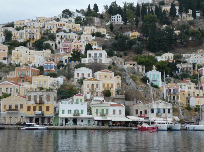 Just one more stop before Turkey, it was back to Symi but this time to the north of the island to the main town in order to complete all the formalities of checking out of the country and the EU.  It was 26 nautical miles (5 hours) without a breath of wind, so a motor all the way.  We had been warned of the “unique” set up of berthing in Symi Harbour with what was described to us as the local Mafia running the mooring buoys.  In the harbour there are mooring buoys to tie your bow to then you reverse to the dock and tie off your stern (the buoys are instead of having to drop your anchor – much better in our opinion).  Anyway the “guys” come out and help you tie to the buoy and dock then charge you €25 euro for doing so (nearly $40 australian dollars).  This cost is not in anyway associated to the fees involved in staying on the dock.  Once you are docked the Harbour Master comes for the harbour fee of €13 euro’s so its cheaper to stay on the dock for 24 hours than it is for 4 minutes assistance to tie your boat up.  We declined the “Mafias” help and picked up the buoy ourselves (and made ourselves very unpopular in the process – with words being directed at us along the lines of, “I need the money to feed my family”).