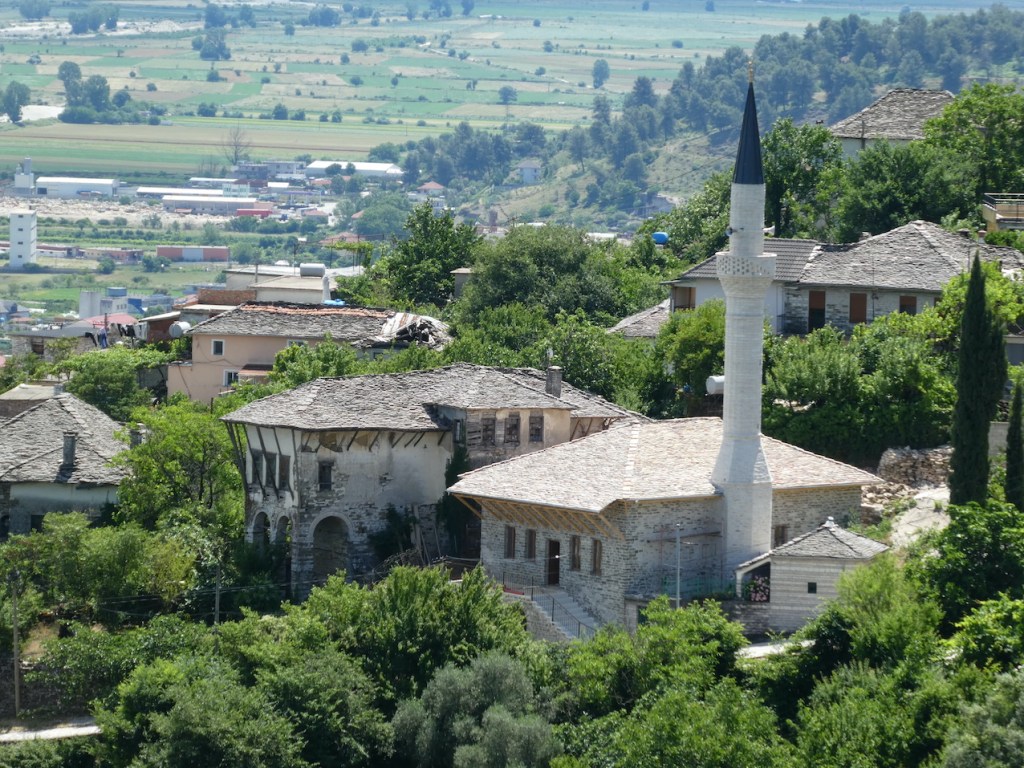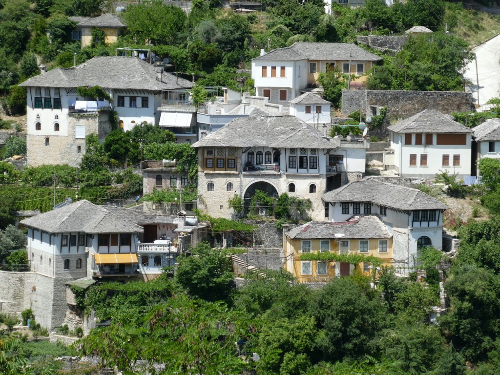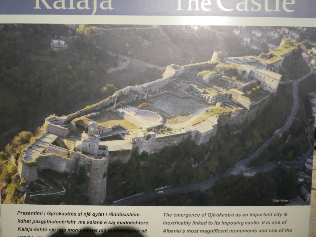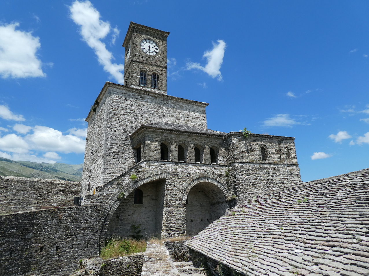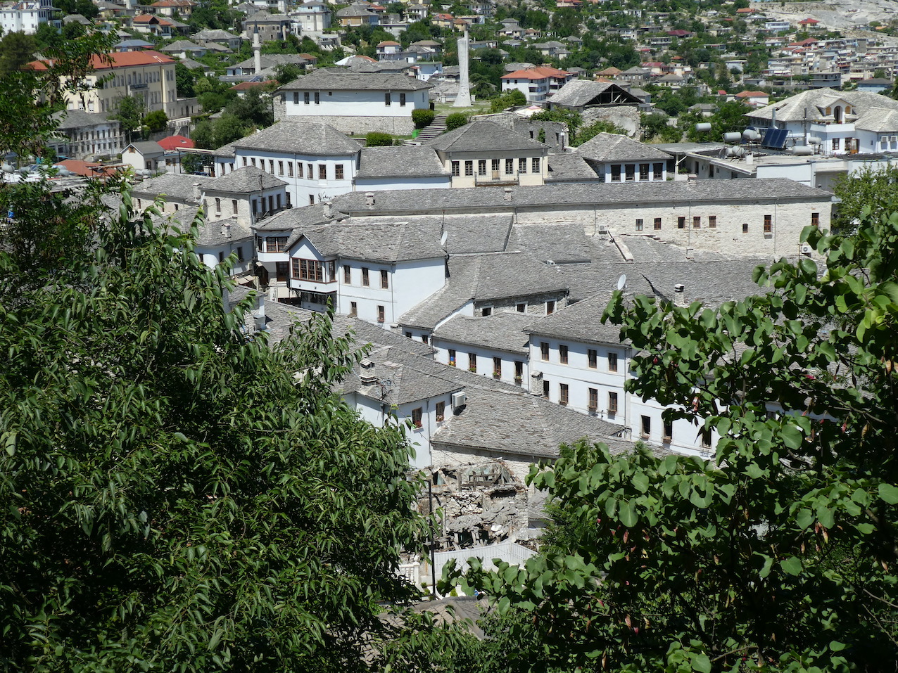 Next we drove up and over the mountains (and down the other side) on a rather old windy road to read the old town and castle of Gjirokastra a UNESCO world heritage site.  It is described as a rare example of of a well preserved Ottoman town built by farmers of a large estate.  The town is overlooked by the Gjirokastër Fortress (castle).  The first offical record of the city appears back in 1336 in Greek records.  The city’s wall date from the third century and the high stone walls of the citadel were built from the six to the twelfth century.  Looking down from the castle over the old town it was beautiful to see all the old slate tile roofs.  Still to this day laid by hand without using any type of glue or adhesive and often having to be moved around a little in winter when it rains to stop a leak penetrating the roof.